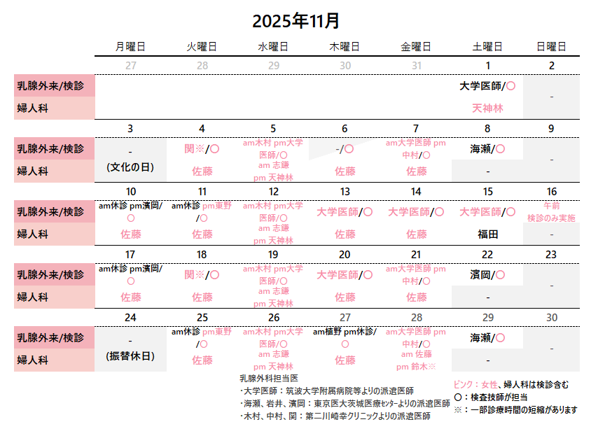 - 11月16日(日)午前、臨時で乳がん検診のみ実施いたします