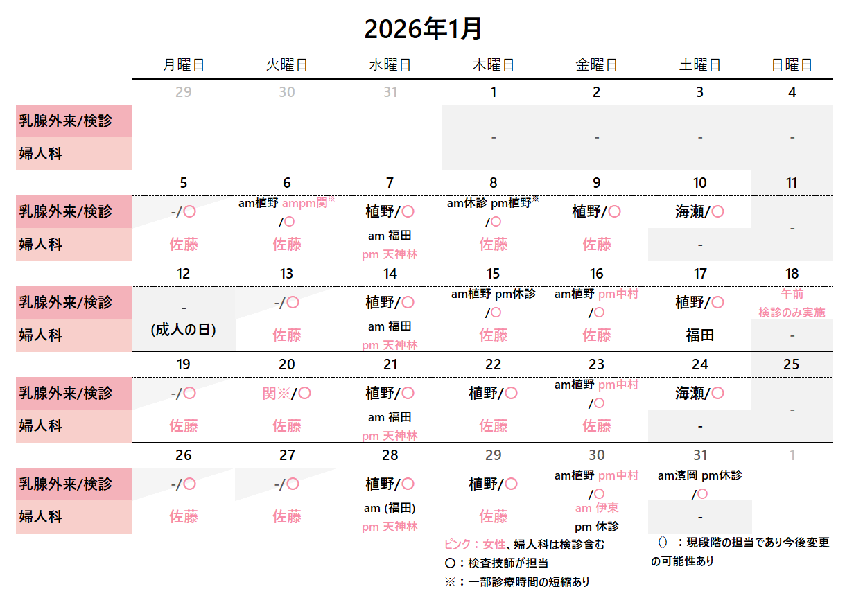 - 1月8日(木)午前、1月13日(火)、1月15日(木)午後、27日(火)は、医師の診察は休診となります(乳がん検診は実施しております)